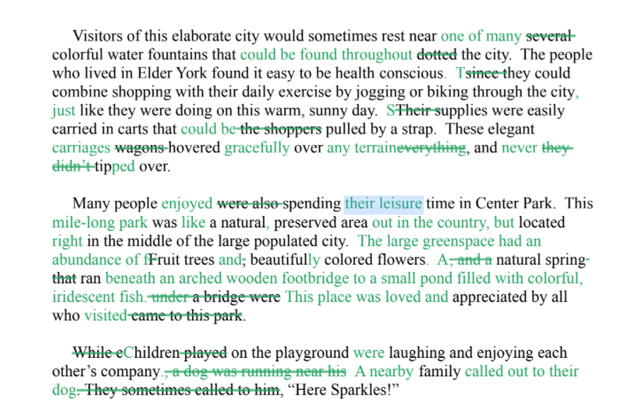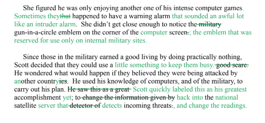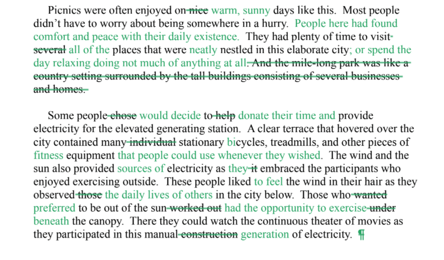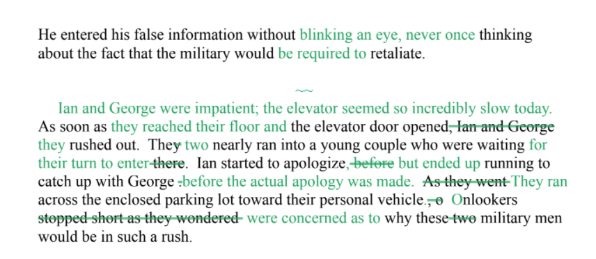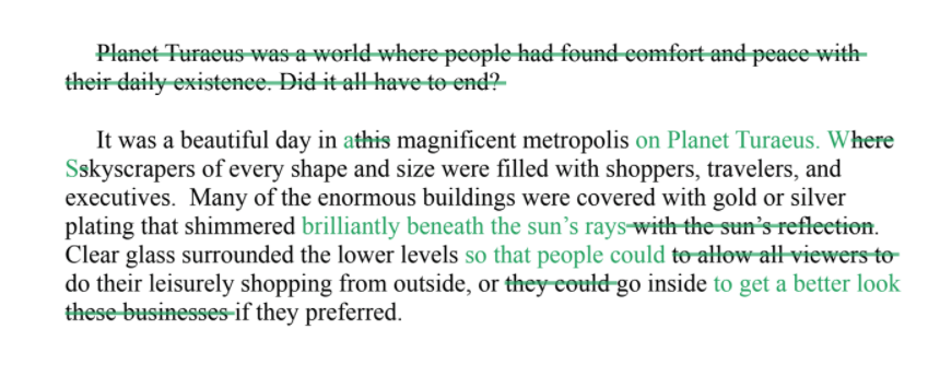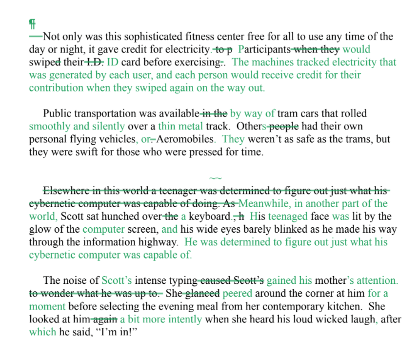 The following are images of some editing work I did for a local author, using Google Docs. This story is published and copyright protected, presented here with consent from the author.